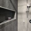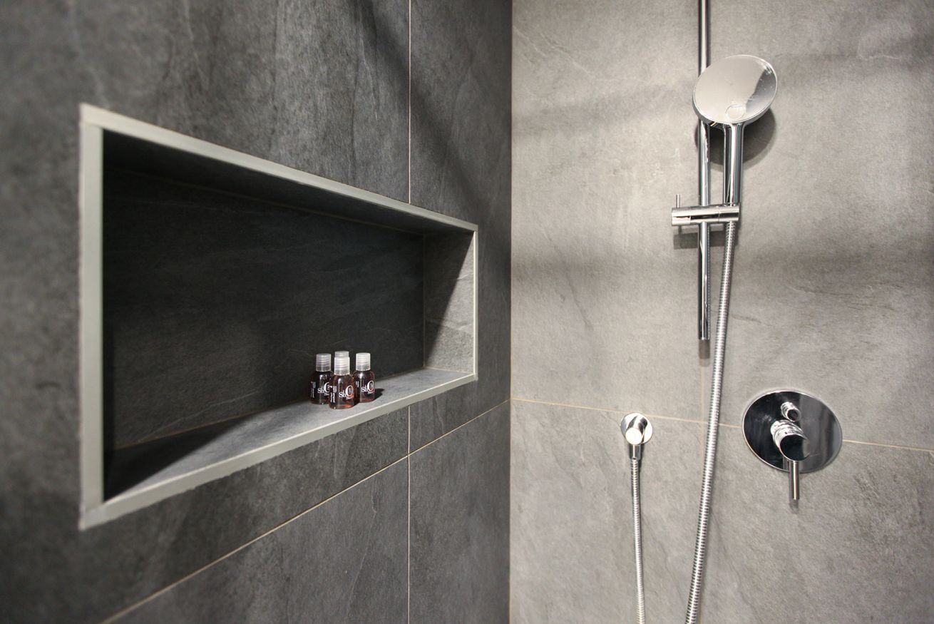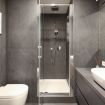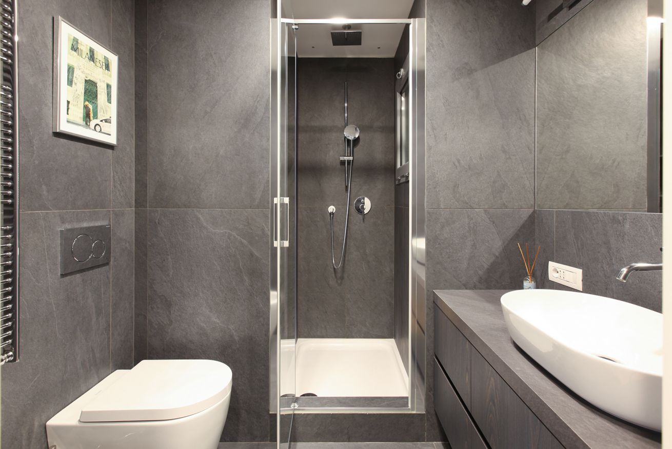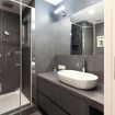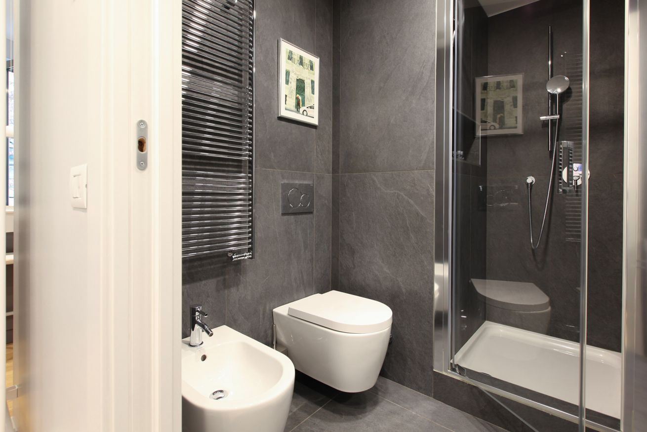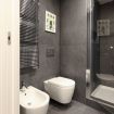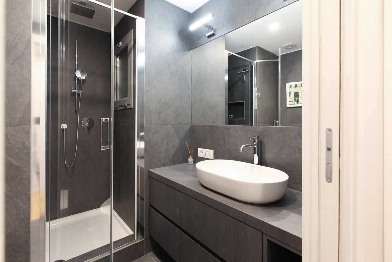 Il bagno, dal design contemporaneo, è dotato di un’ampia doccia walk-in e materiali di alta qualità.