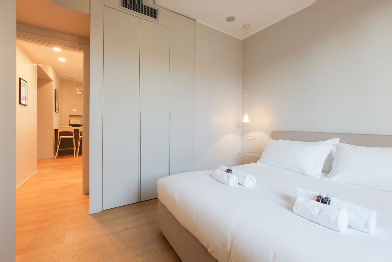 La camera matrimoniale, silenziosa ed elegante, è arredata con un materasso premium e finiture di pregio, garantendo il massimo comfort e riposo.