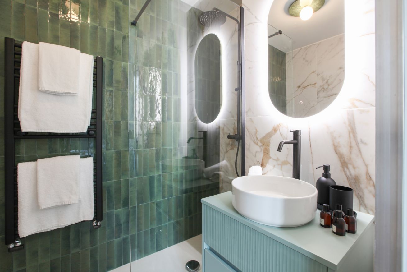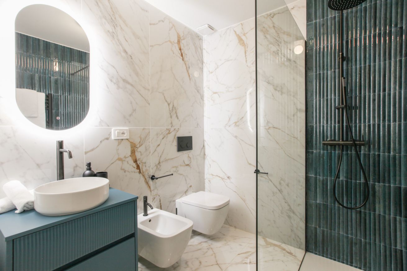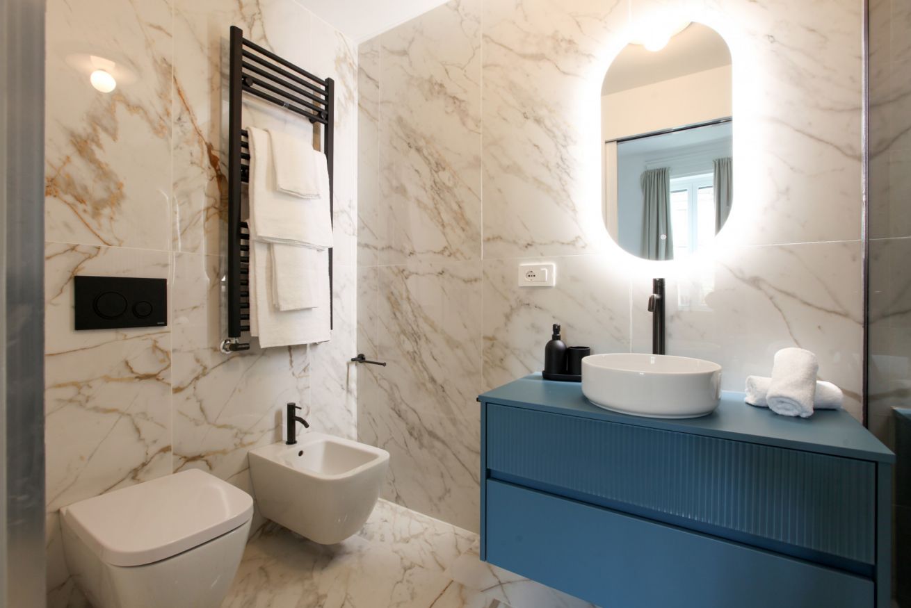 in questo elegante appartamento di nuova ristrutturazione con tre spaziose camere da letto, ciascuna con bagno privato en suite.